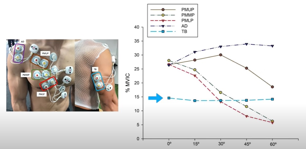 1995년에는 디클라인과 수평, 인클라인, 수직 벤치 중에 인클라인에서 윗가슴의 가장 높은 활성화가 입증되었고 1997년에는 근전도 전극을 윗가슴과 아랫 가슴에 부착하여 각각 인클라인과 디클라인에서 부위에 따라 더 높은 근육 활성화를 입증하였고 2010년에는 인클라인의 각도를 조금 더 세분화하여 0 º 와 28 º, 44 º, 56 º로 윗가슴의 근육 활성화를 파악하였는데 이 중 44 º에서 가장 높은 근육 활성화가 나타났습니다