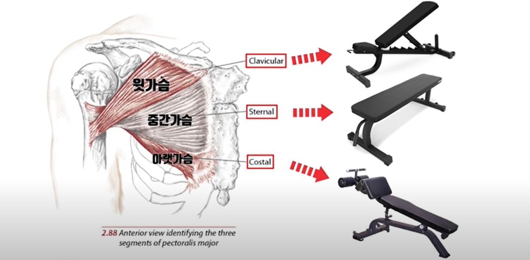 가슴은 크게 3 부위로 나뉘어 윗부분이랑 중간 부분, 아랫부분을 인클라인 벤치프레스, 플렛 벤치프레스, 디클라인 벤치프레스로 각각의 부위를 타깃 할 수 있습니다